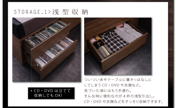 そんな時に便利なのが4杯の浅型引出し。CD・DVDや衣類などをすっきり収納できます。