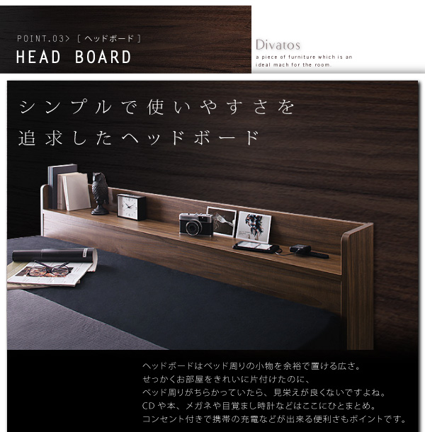 ヘッドボードはベッド周りの小物を余裕で置ける広さ。