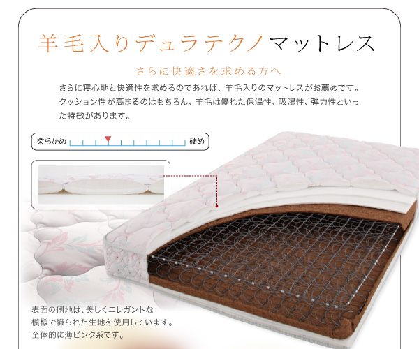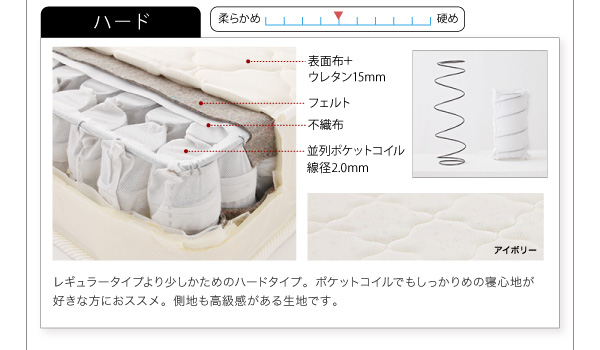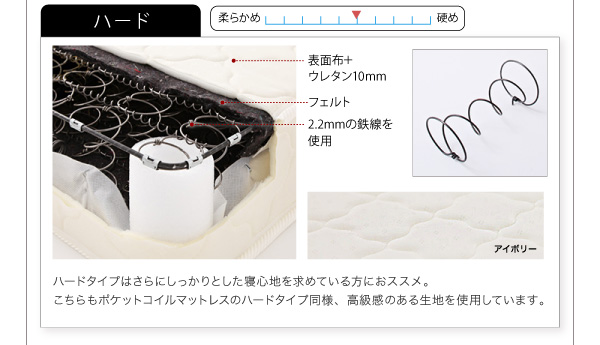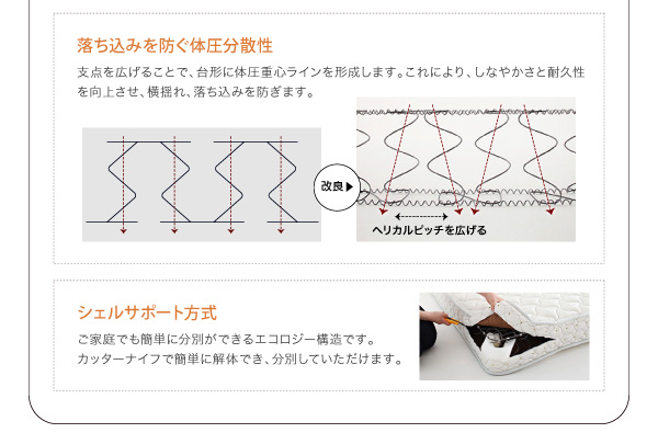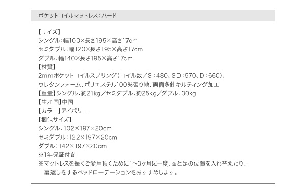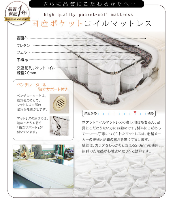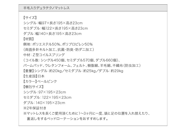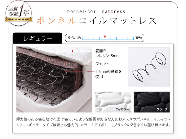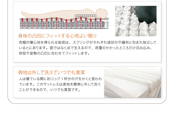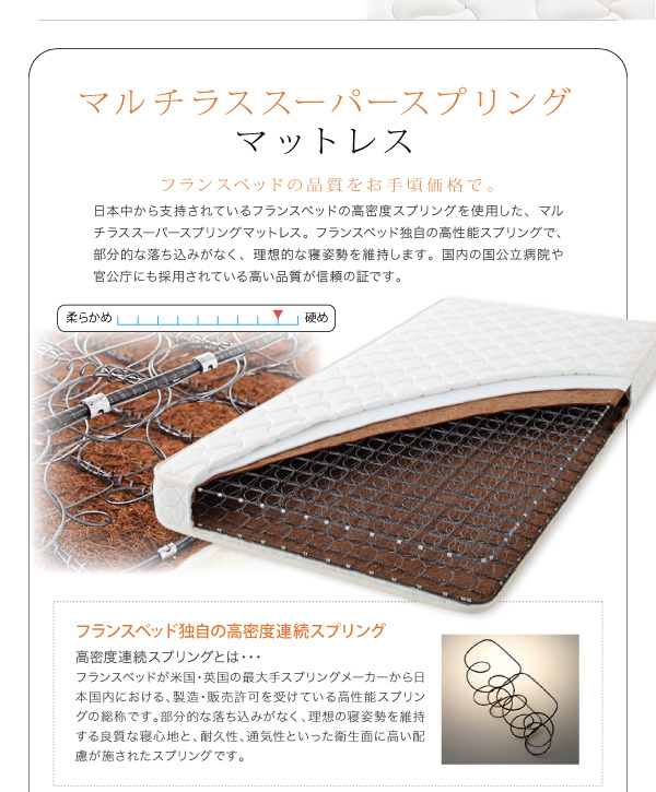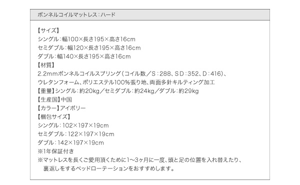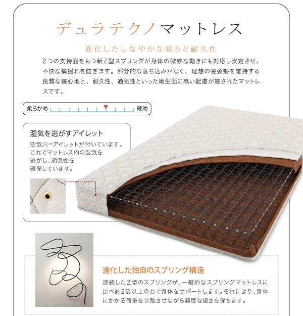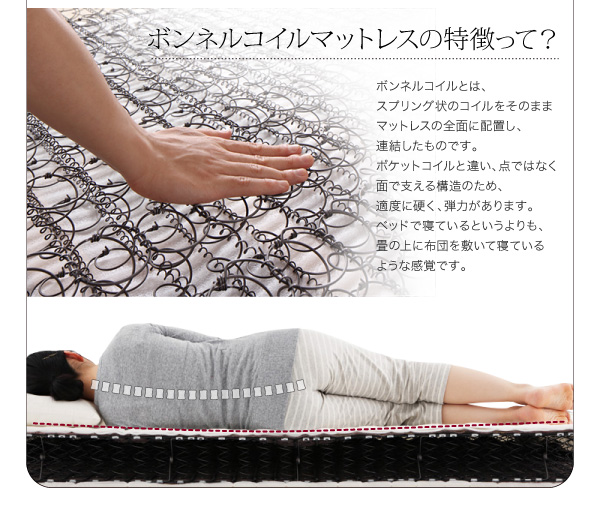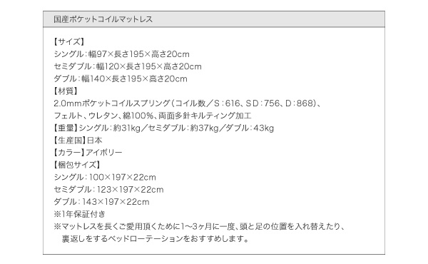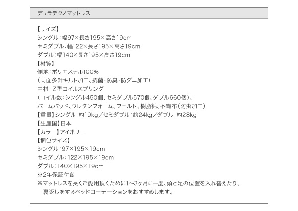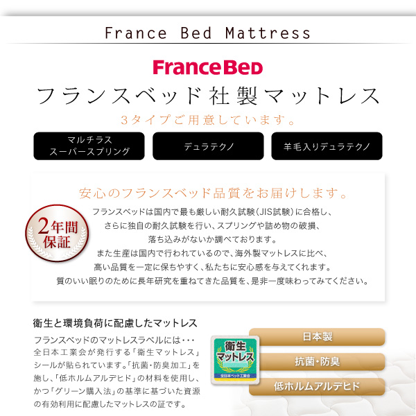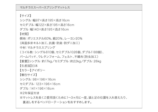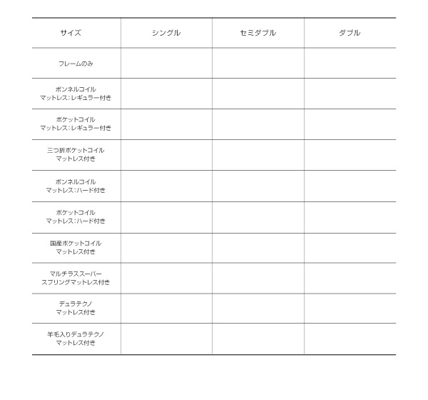 ※ベッドのフレームはスプリングマットレス使用時の基準で強度計算されております。そのため、床板に直接布団等を敷いてご利用になりますと破損の原因になる場合があり、大変危険です。