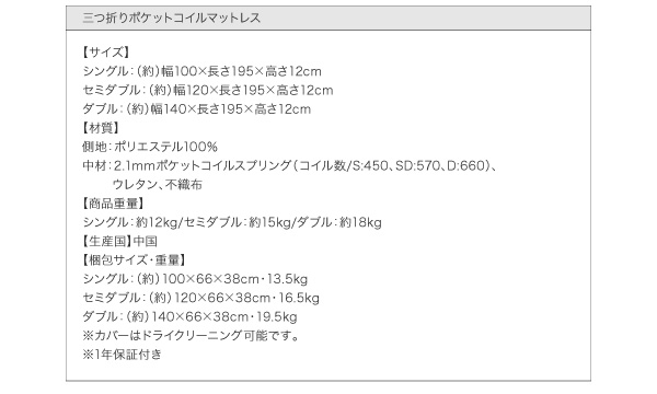 シングル:(約)118×74×8cm・19kg、75×48×19cm・17kg、73×43×17cm・22kg、107×48×15cm・20kg、106×60×11cm・10kg